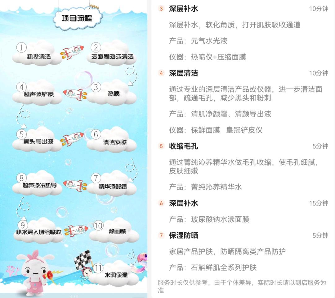 在此背景下,多数连锁洗脸吧开始尝试拓展服务边界。大众消费平台上的项目介绍中,逐渐出现祛痘、舒缓、提亮、淡化细纹等描述。同时,部分门店引入热喷仪、铲皮仪、洗脸机、小气泡仪等非侵入式设备,以丰富服务流程。
