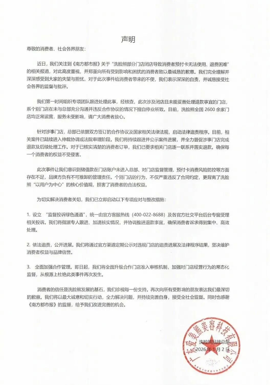 消息扩散后,洗脸熊官方道歉并迅速发布声明回应:涉事为个别门店,未与总部沟通,自行违反协议。目前总部已启动法律追责程序,将持续跟进并公示进展。目前全国2600余家门店正常运营,消费者可继续使用会员服务。