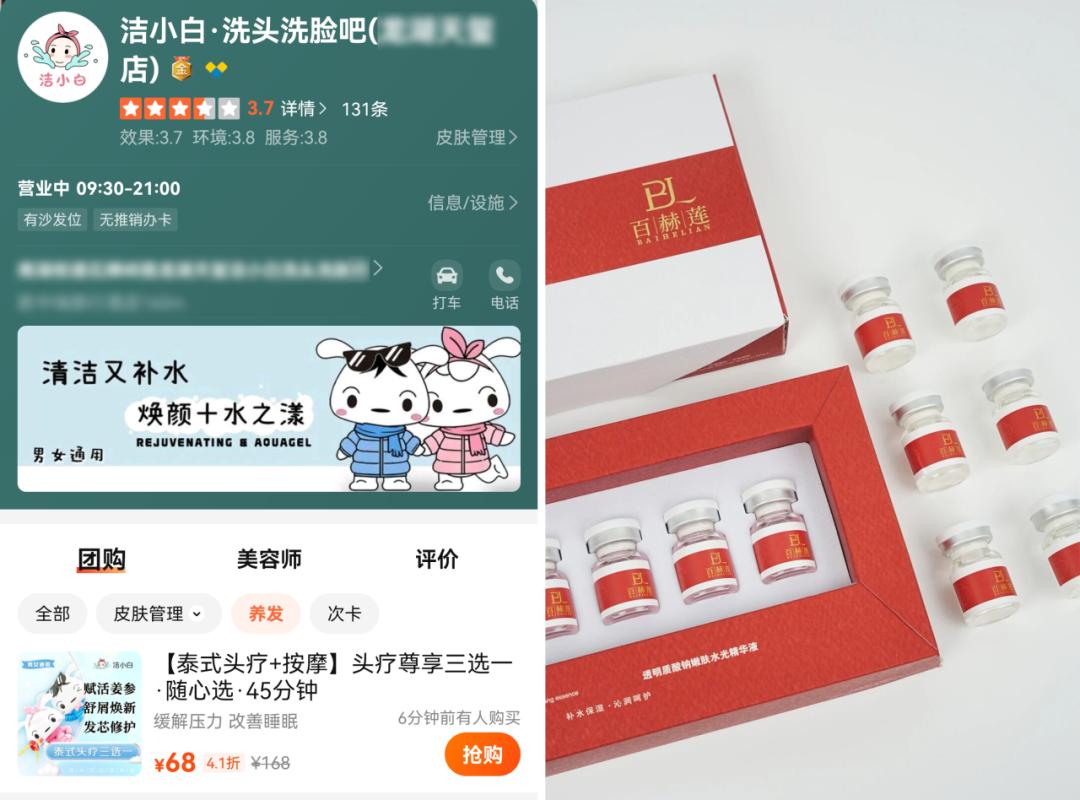 洁小白提供的头部水疗服务(左)娜朵旗下自品牌研发的产品(右)图源网络