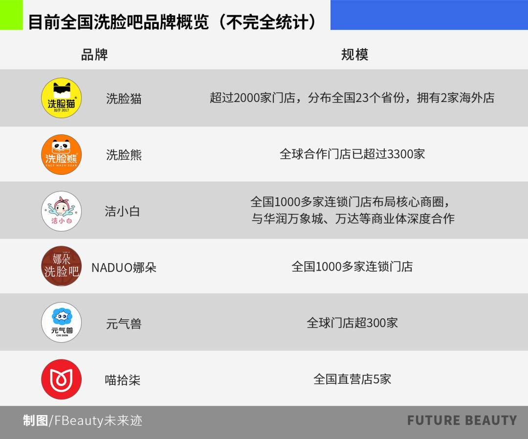 从核心玩家来看,行业已形成阶梯结构。位于顶层的是以“洗脸猫”和“洗脸熊”为代表的第一梯队。凭借绝对的先发优势和资本驱动的加盟策略,实现了规模的快速扩张。