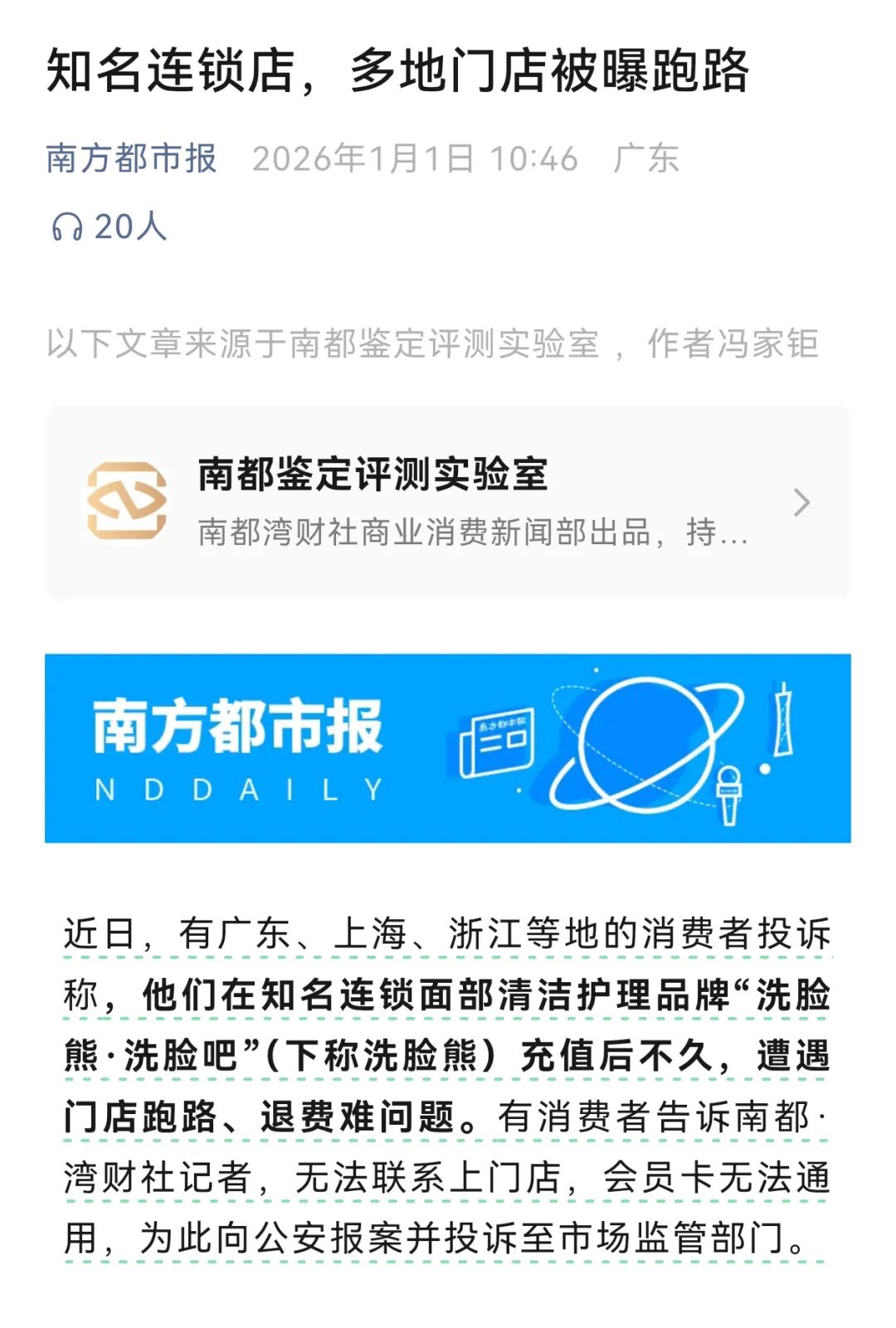 1月1日,据南方都市报消息,面部清洁护理品牌“洗脸熊·洗脸吧”(下称洗脸熊)被广东、上海、浙江等多地消费者反映,在相关线下门店充值会员卡后不久,门店即停止营业,且未能取得有效沟通渠道。