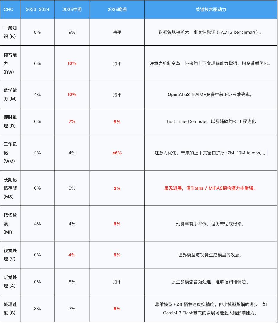 第一,2025年,技术进步主要集中在流体推理(Fluid Reasoning)、长期记忆(Long-term Memory)、空间智能(Spatial Intelligence)以及元学习(Meta-learning) 这四个领域。原因在于Scaling Law在单纯的参数规模上遇到了边际效应递减,为了突破AGI