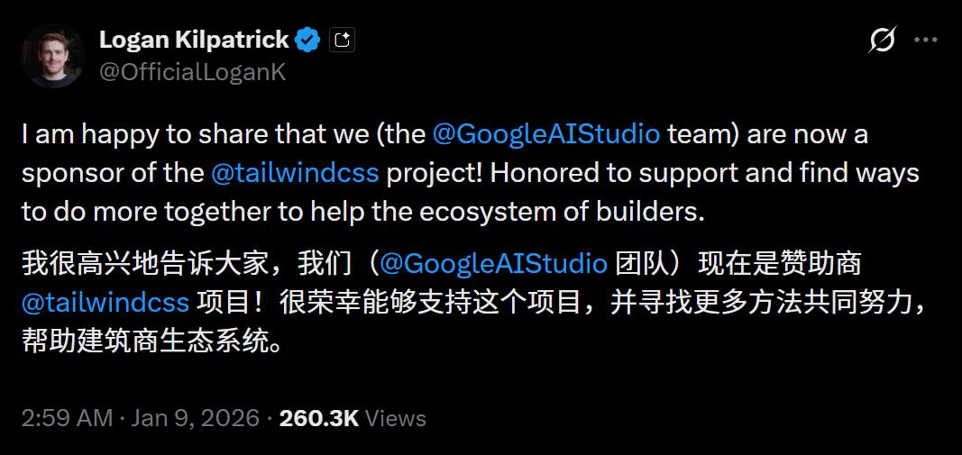 首先,Google AI Studio宣布:我们将成为Tailwind CSS项目的赞助商!