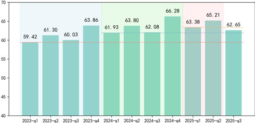 可以为这个观点提供佐证的,是近日由北京大学国家发展研究院等机构联合编制的《中国线上消费品牌指数(CBI)第三期报告》(以下简称报告),在远离“618”与“双11”的2025年第三季度,全国线上消费品牌指数(CBI)依然达到了62.65,较2023年同期增长4.4%,2024年同期增长0.92%,而且2023年以来每个季度同比都是增长的。