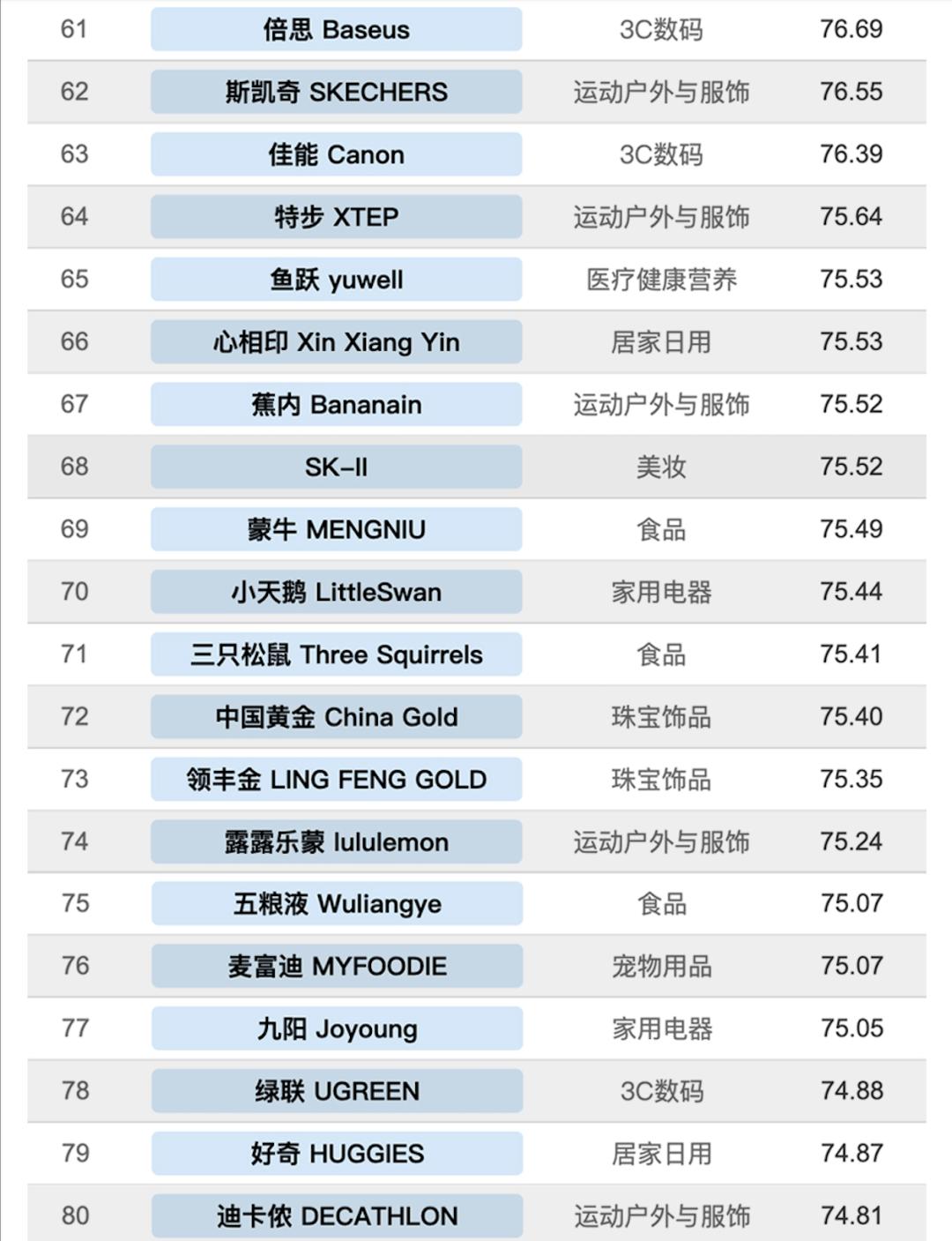 当每个品牌分值确定,一份既涵盖了苹果、大疆、耐克、李宁等头部品牌,也涵盖了所有白牌的全网品牌评分由此诞生。然后再根据评分,计算每个季度中国消费者的消费平均分,也就是CBI指数(比如运动户外行业最高分分别是,耐克、阿迪、李宁、安踏、斐乐,都是80分以上的优质品牌,消费购买的多就会指数高,反之购买没有名气的白牌多,同比就会低)。