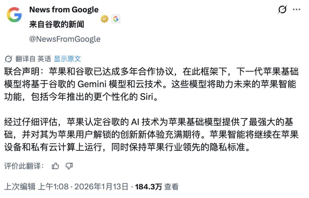 按照联合协议, Google Gemini 模型将运行在苹果的「私有云计算」服务器上, 用户数据不会接触 Google 的系统。这意味着苹果既能享受 Google 的技术, 又能保持对用户隐私的掌控。