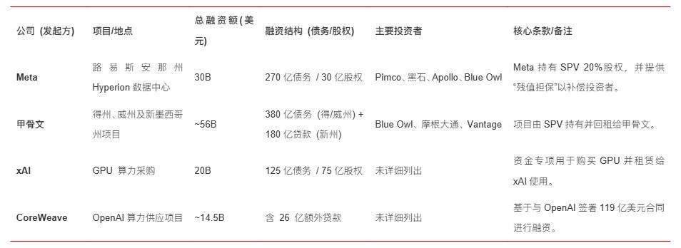 截至目前,Meta、xAI、甲骨文和新兴云厂CoreWeave已通过复杂融资交易筹集超过1200亿美元数据中心资金。