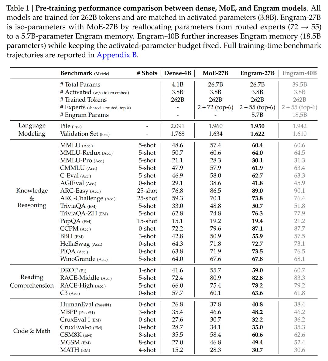 在这一规律的指导下,DeepSeek 将 Engram 扩展至 270 亿参数规模,并在严格等参数量、等 FLOPs 的条件下,其整体性能显著优于纯 MoE 基线模型。