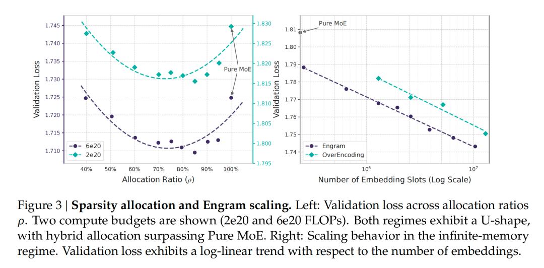 图 3(右)展示了增加内存槽数量会显著改善验证损失,并且这一改进在整个范围内持续稳定。该曲线遵循严格的幂律(在对数空间中线性),这表明 Engram 提供了一个可预测的扩展旋钮:更大的内存在不需要额外计算的情况下继续带来收益。