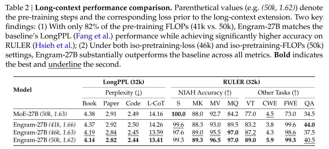 极端设置(约 82% 计算量):即使是提前停止训练的 Engram-27B(41k 步),在面对完整训练的 MoE-27B(50k 步)时依然极具竞争力。它在 LongPPL 指标上与基准持平,并在 RULER 测试中实现超越,这充分证明了 Engram 架构的内在优越性。