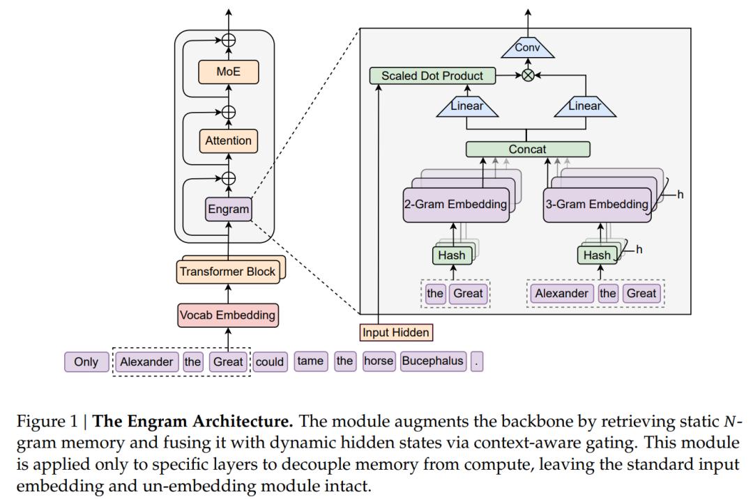 针对这一现状,DeepSeek 提出了条件记忆(conditional memory),从而与 MoE 的条件计算互补,并通过引入一个新模块 Engram 来实现。