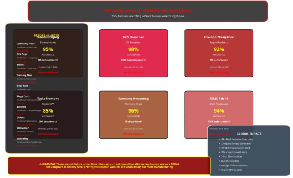 富士康为苹果产品打造的“无人值守”生产线堪称这一趋势的巅峰之作。这些工厂的生产区域实际上无需照明,因为无需人工干预。这既是字面意义上的“黑暗制造”,也是比喻意义上的“黑暗制造”。