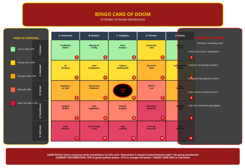 所以,面对混乱,任何一个理智的人都会这样做:我创建了一个框架,将混乱的局面转化为一个简洁的末日网格。最终得到的是一个 5x5 的矩阵,它基于两个简单的问题来绘制每个组织:1. “你的自动化程度如何?”和 2. “你的商业模式在多大程度上依赖于人工智能?”该模型基于 400 多个组织、50 多篇研究论文和 3685 亿美元的投资数据,最终得到 25 个单元格,代表25 种使人类变得无关紧要的不同方法。