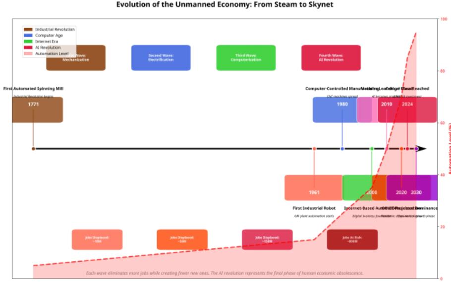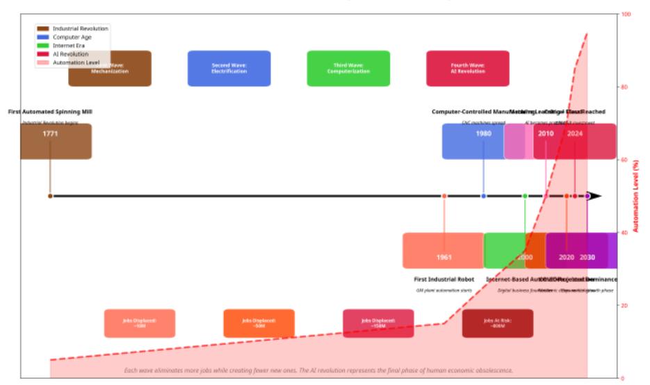 时间线显示,每一波自动化浪潮都会淘汰更多的人类工作岗位,而创造的新岗位却越来越少。别信“技术会取代工作,但总会创造新的工作岗位”。当然,如果你拥有机器学习博士学位,专攻具身人工智能,那你的未来或许会很惬意;但如果你的日常工作只是拧牙膏管盖,那还不如去学学怎么乞讨。