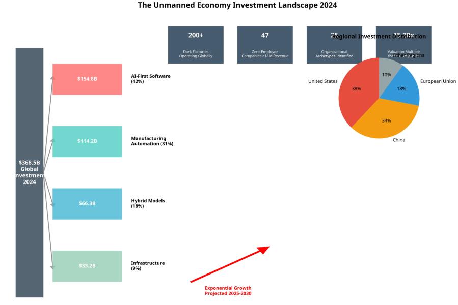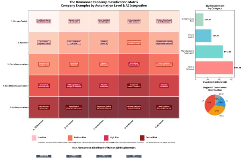 资金正以前所未有的速度流向人力替代领域。仅2024年一年,投资额就高达3685亿美元。投资模式揭示了全球经济的真正优先事项:近一半的无人经济投资流向了人工 智能软件公司——这些公司旨在无需人类员工即可运营;另有三分之一的资金流入了制造业自动化领域,这将导致工厂工作岗位的消失。
