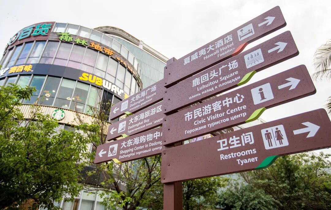 △三亚市大东海广场路段的中英俄三语旅游标识牌。(图/视觉中国)