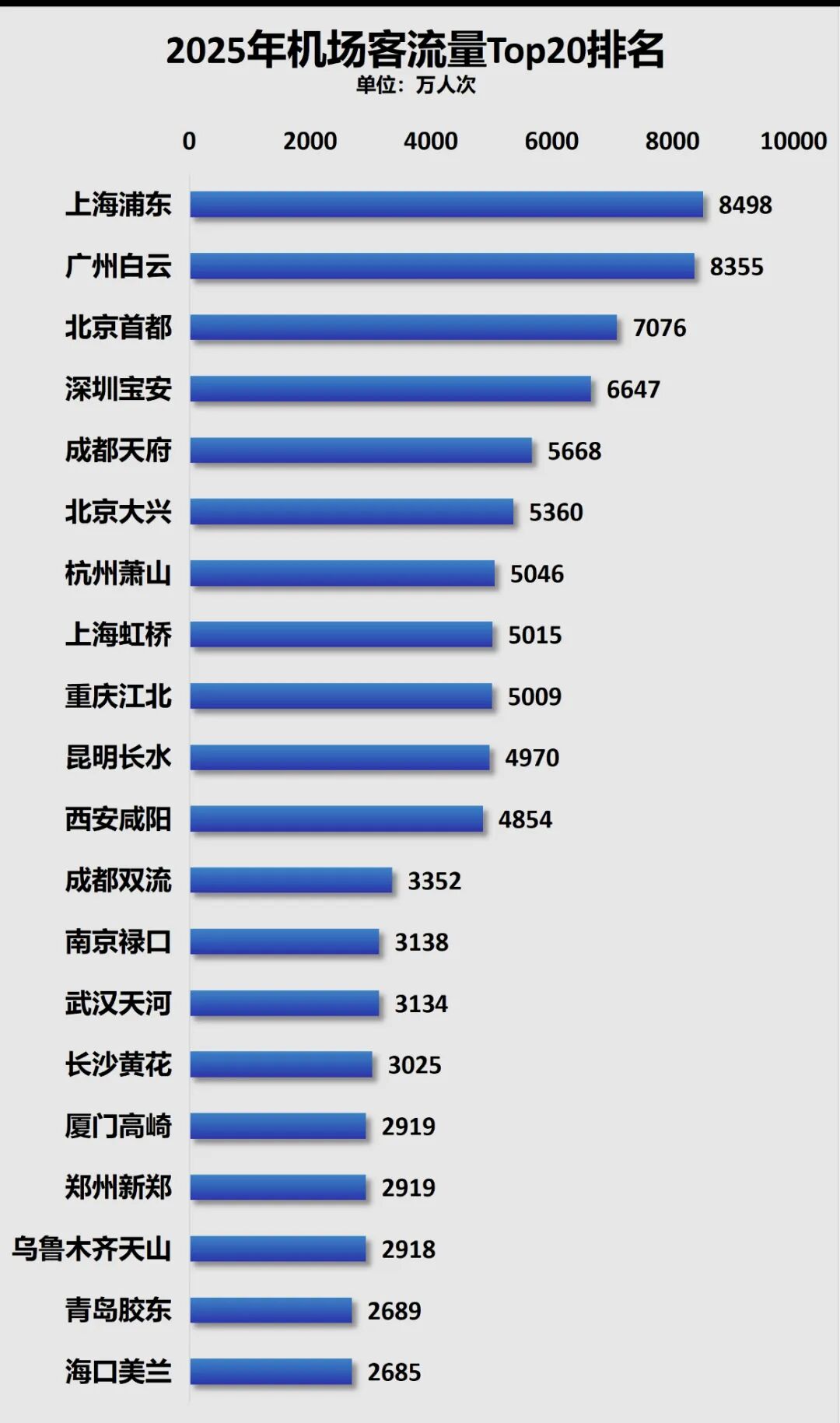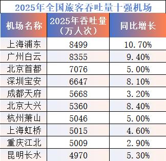 如排名最靠前的上海浦东机场和广州白云机场,吞吐量均突破8000万人次。全国前十大机场中,有9座的吞吐量都超过了5000万人次。