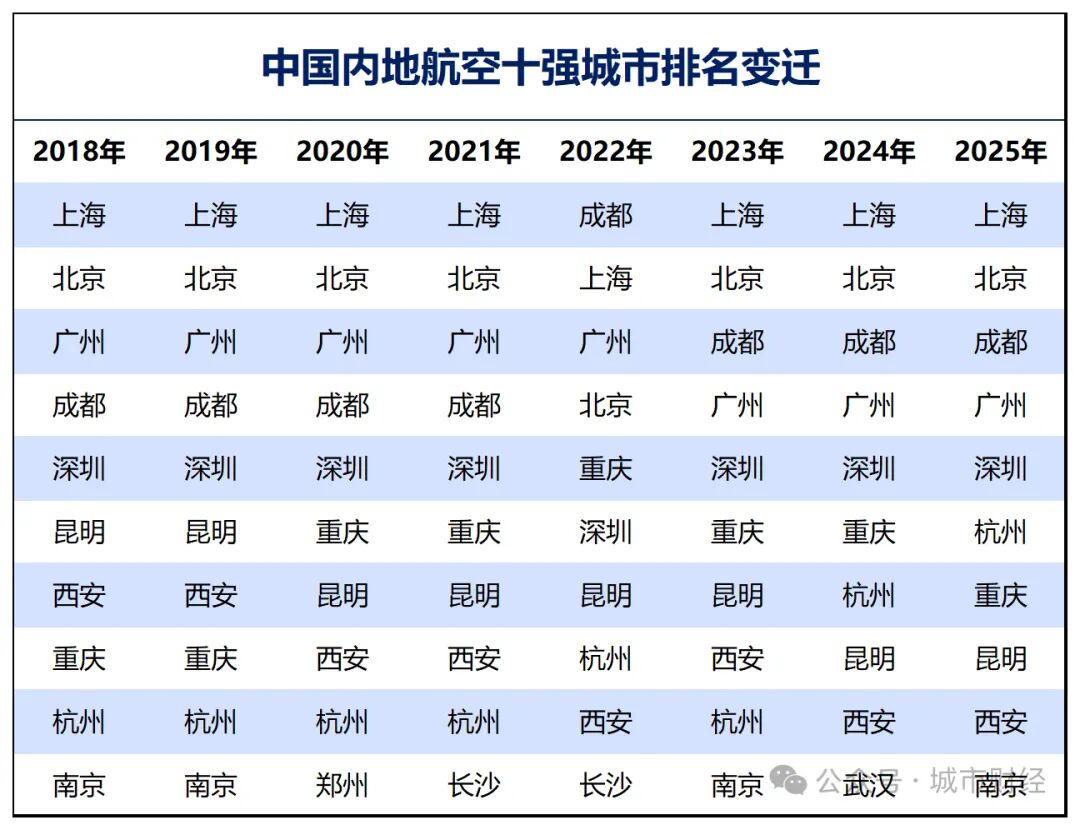 从头部航空枢纽城市格局来看,近几年最大的变化可以总结为:成都反超广州,跻身前三;重庆与深圳、杭州展开对“第五城”的争夺;西安、昆明排名有所下滑;武汉、南京角逐十强。