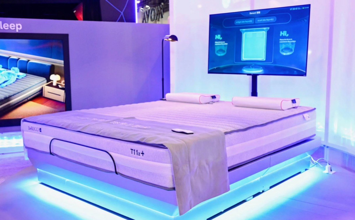 慕斯在CES现场展出了T11+升级款,AI潮汐算法3.0作为大脑,结合腰部传感器等组件,AI智慧睡眠系统监测心率、呼吸、睡姿,通过智能床+床垫的结合,判断睡眠阶段和身体状况从而做出调节决策。