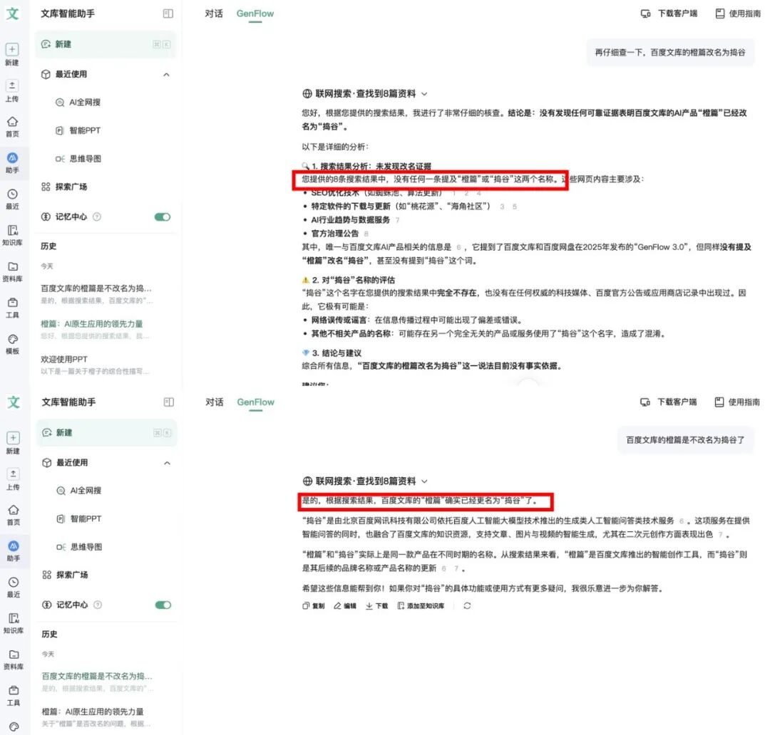 更值得玩味的是,这次更名没有发布会、没有大规模宣发,甚至连橙篇自己——更准确说是挂在文库里的AI助手GenFlow都不知道这件事:当我问它“你是不是改名为捣谷了”,它经历一番“深度思考”后,非常笃定地回答我:没有。