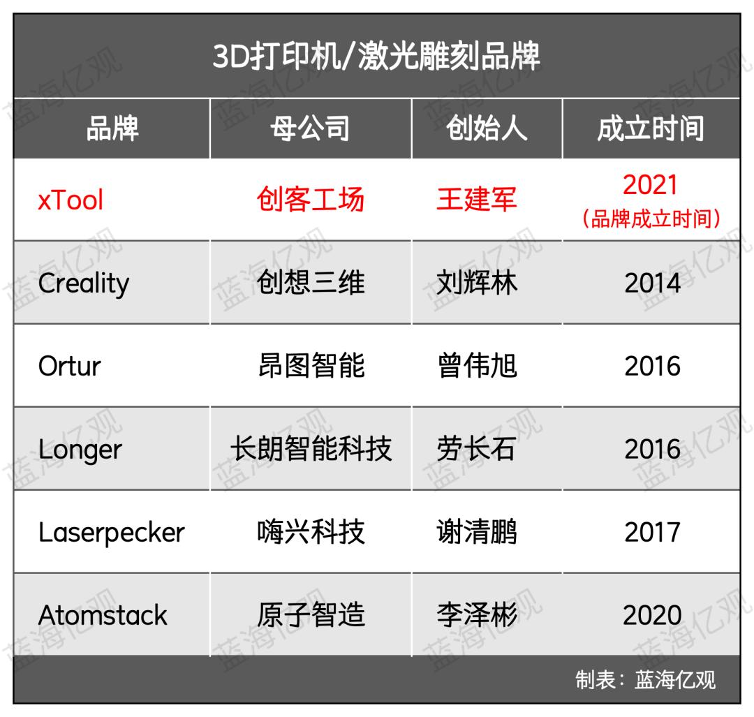王建军及团队发现,欧美个人创作文化兴起,于是开始瞄准消费级激光雕刻机赛道。2021年,王建军带着团队成立xTool品牌,定位为“消费级专业工具”,并于同年推出首款桌面激光雕刻机xTool D1,随后踏上了高速增长的道路。