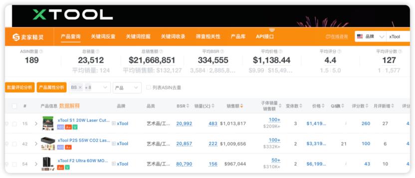 xTool在亚马逊美国站的表现突出。卖家精灵www.sellersprite.com数据显示,最近30天,在xTool品牌下,销量排名前189的ASIN,预估总销量约2.35万单,总销售额约2166.9万美金。(该数据为估算,可能含部分跟卖及品牌授权,实际销量或受新品上架、活动节奏等因素影响而波动。)
