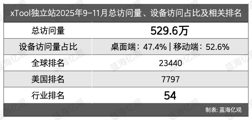 xTool海外独立站商城的流量已经达到了一定规模,且流量结构相对健康。最近3个月(2025年9-11月),其独立站总访问量达529.6万。其中,自然搜索流量中,品牌关键词的搜索流量占比达77%。然而,其整体流量仍依赖付费投放,约有24.4%的流量由付费广告在支撑,远高于自然流量(占比19.08%)。