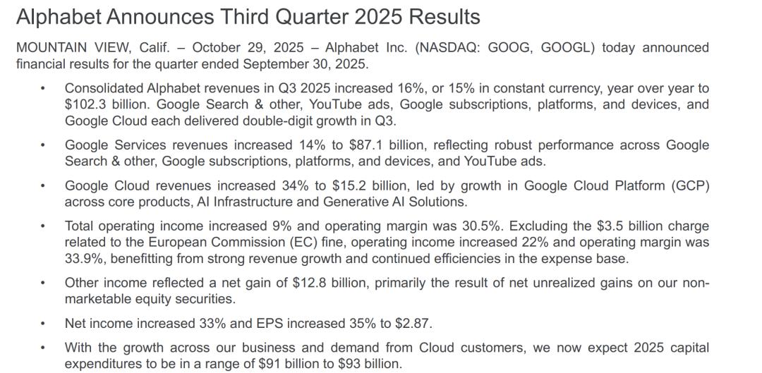 2025 Q3 财报显示:谷歌云业务营收增长 34%,达 152 亿美元,来源:Alphabet Investor Relations