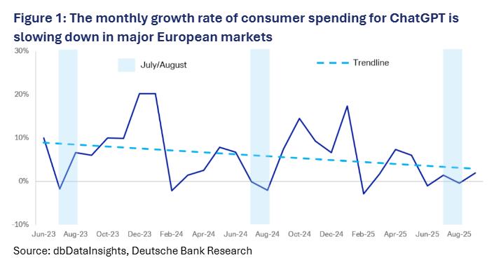 此外,欧洲市场情况更为严峻,据德意志银行研报显示,自 2025 年 5 月起,ChatGPT 在法国、德国、意大利、西班牙和英国五大市场的消费者支出几乎停滞,付费用户增长可能已触顶,每周活跃用户虽达 8 亿,但付费订阅用户仅约 2000 万,与其 5000 亿美元估值形成巨大落差。