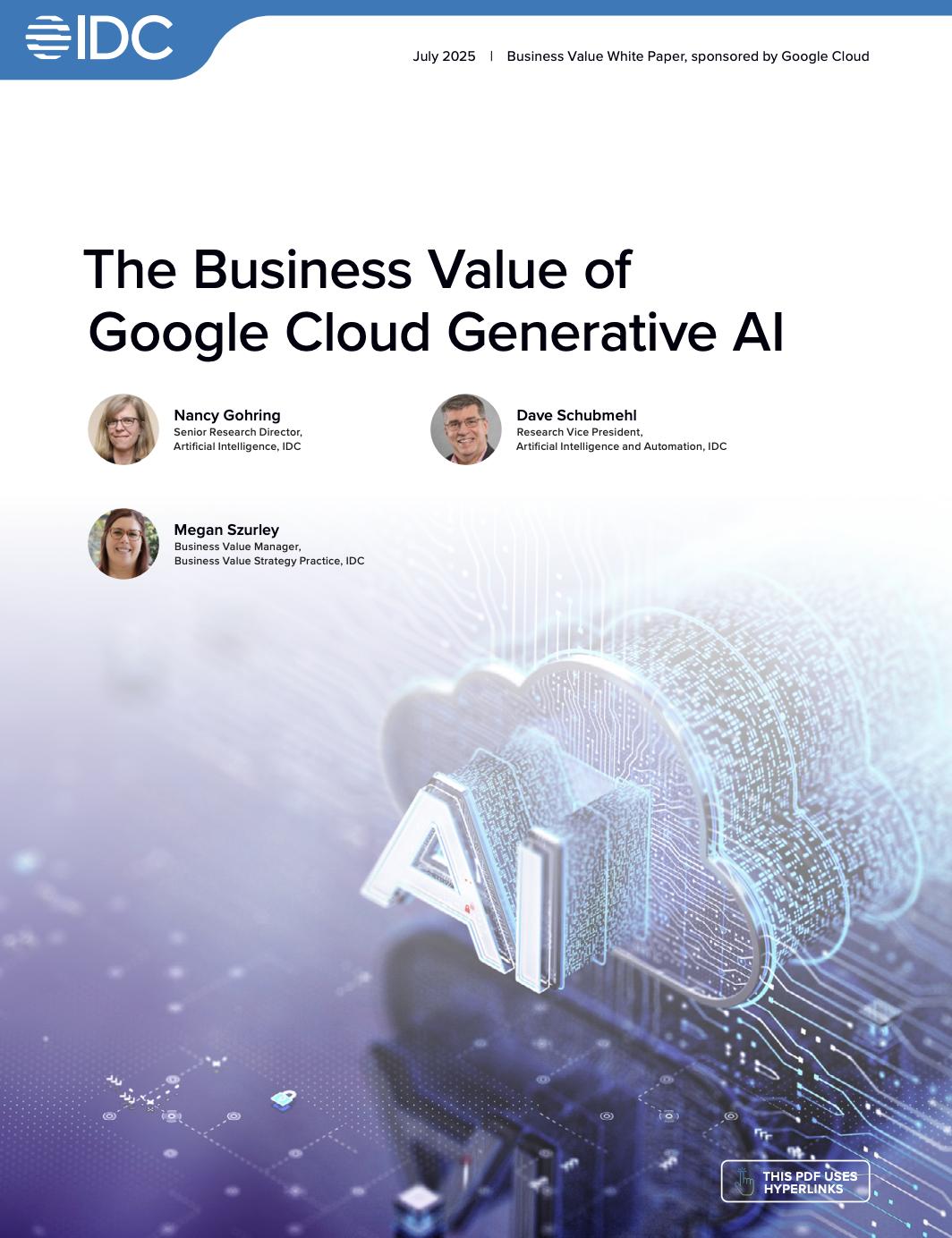 Google 与 IDC 团队合作调查报告《The Business Value of Google Cloud Generative AI》,包含超过 600 家公司如何在其运营和产品中使用 Google Cloud AI 的案例