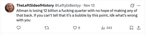 事实上,在 OpenAI 每个季度亏损 120 亿美元,且几乎看不到回本希望的窘境下,AI 泡沫似乎已经到来,不少用户为 AI 唱衰。