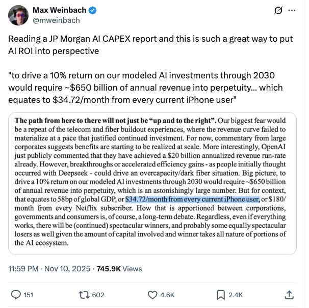 摩根大通的分析进一步揭示了行业性难题:要实现 10% 的投资回报率,全球 AI 产业需在 2030 年前实现 6,500 亿美元的年营收,这一数字相当于要求每个 iPhone 用户每月额外支付 34.72 美元,或每个 Netflix 订阅者每年多付 180 美元 —— 显然,当前消费市场的付费意愿远未达到这一水平。