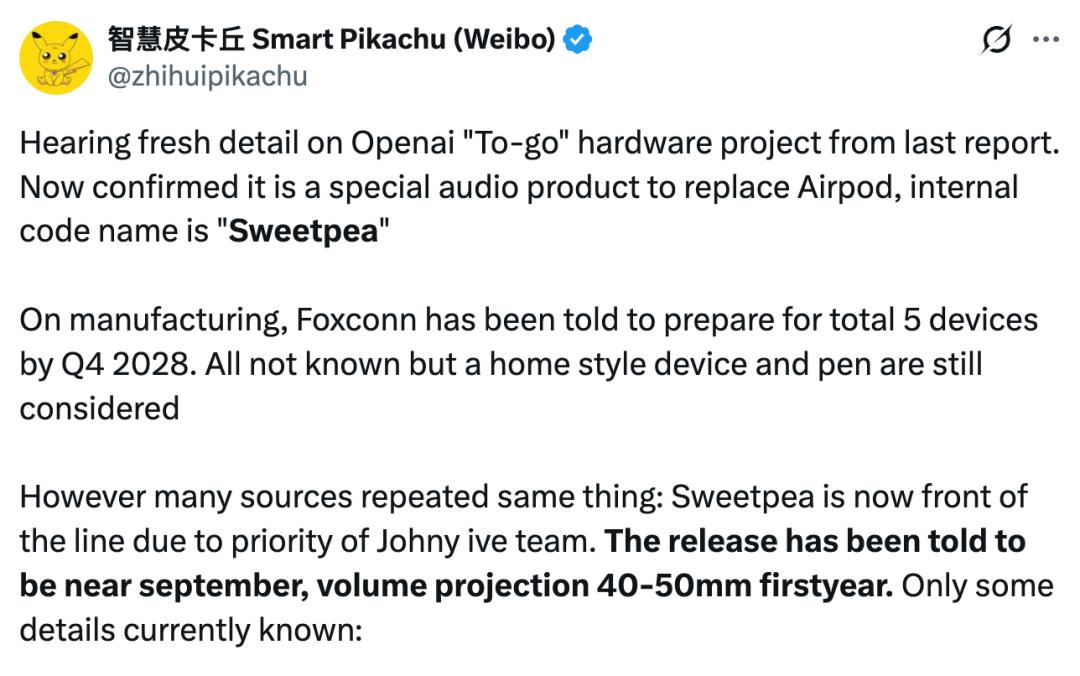 今天一早,数码博主 @智慧皮卡丘透露了关于 OpenAI「To-go」硬件项目的最新细节。