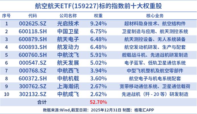 航空航天ETF(159227)的前十大权重股,清晰地展现了航空航天产业的核心链条,从最前端的航空发动机、航空材料、机载系统,再到最终的飞机整机和航天系统,成份股覆盖战斗机、航空发动机、火箭、导弹、卫星、雷达等全产业链龙头。
