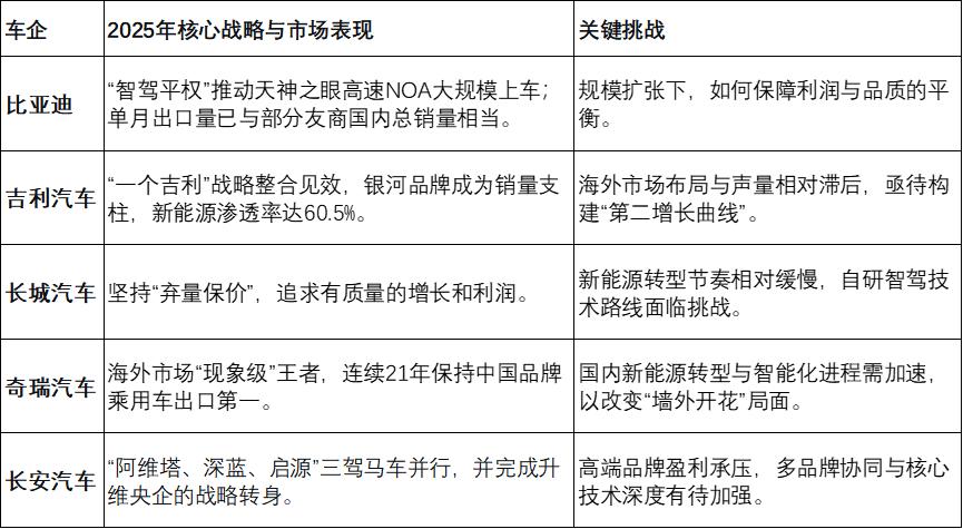 在自主品牌“五常”阵营中,2025年呈现出迥异的战略选择和处境,下表梳理了其核心特点: