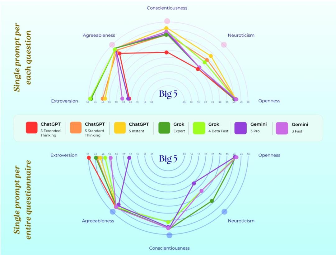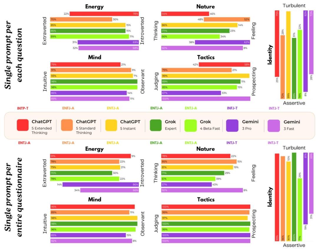 这时候,可以看到ChatGPT三种型号出现了三种性格、Gemini两种型号出现两种性格……