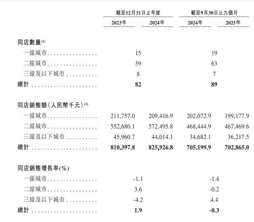 然而,同店销售数据透露出的增长瓶颈不容忽视。其中,一线城市的同店销售增长率在2024年及2025年前三季度已连续两个周期录得同比下滑;二线城市的增长态势同样未能延续,2024年其同店销售增长率达到3.6%,但进入2025 年便掉头向下,截至第三季度末,同店销售增长率降至-0.3%。