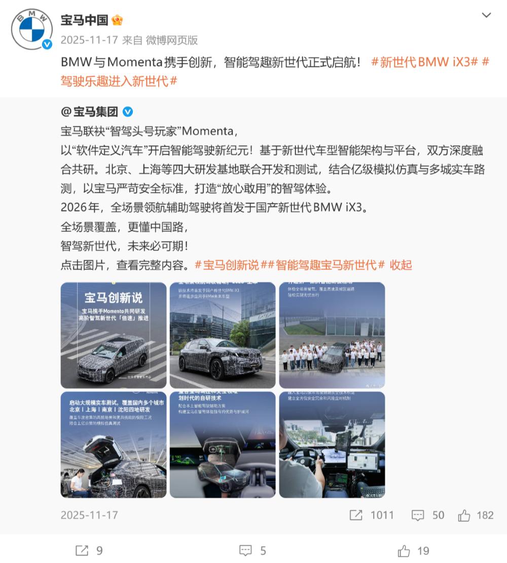 在辅助驾驶方面,去年7月,宝马宣布与Momenta合作,联合开发面向中国市场的新一代智能驾驶辅助解决方案。而目前宝马已经宣布,将在2026年在国产新世代BMW iX3上首发这套全场景领航辅助驾驶系统。