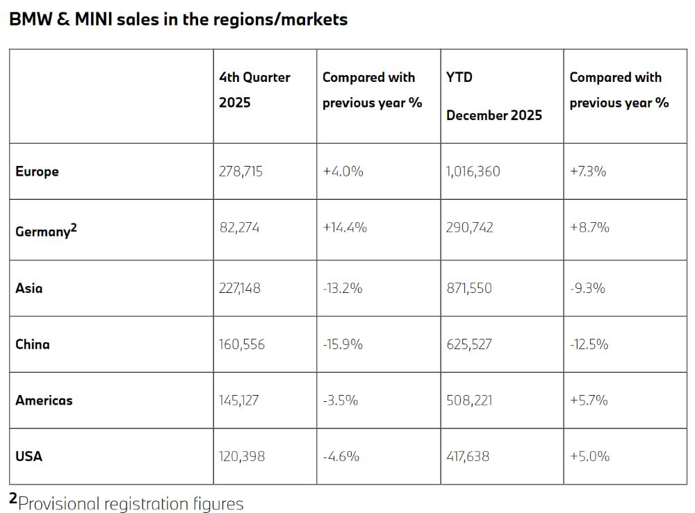 2025年宝马在欧洲市场的销量为101.64万辆,同比增长7.3%,第四季度在欧洲的销量为27.87万辆,同比增长4%;其中在宝马的大本营德国全年销量为29.07万辆,同比增长8.9%,第四季度销量8.23万辆,同比增长14.4%。