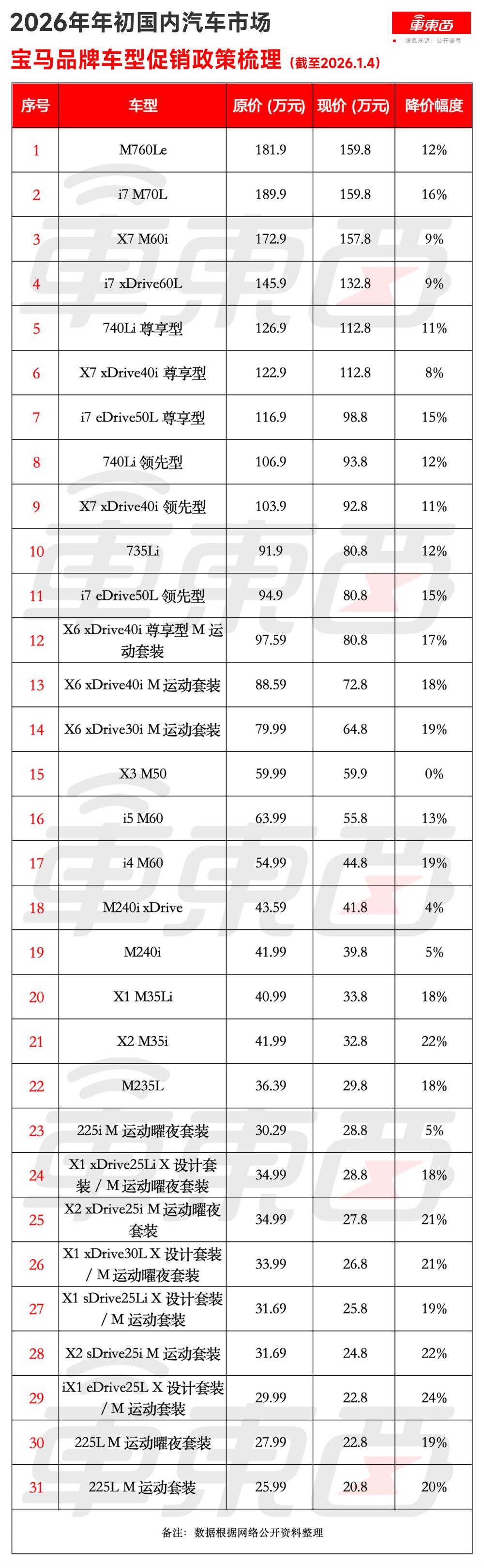 面对销量下降,BBA们自然在2026年有所动作。在2026年刚刚开年,宝马中国就下调了31款车型售价。具体来看,宝马价格调整涉及的车型范围非常广泛,包含旗舰和入门车型,其中24款车型的降幅超10%,还有5款车型的降价幅度超过了20%。