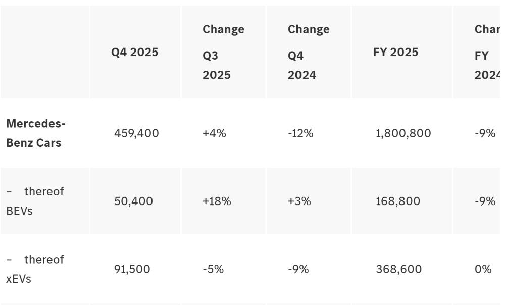 具体来看,2025年奔驰共售出216万辆乘用车和轻型商用车,其中乘用车(Mercedes-Benz Cars)全年销量为180万辆,同比下滑9%,全年纯电动乘用车(BEV)与插混(PHEV)车型销量合计36.86万辆,基本与去年持平。