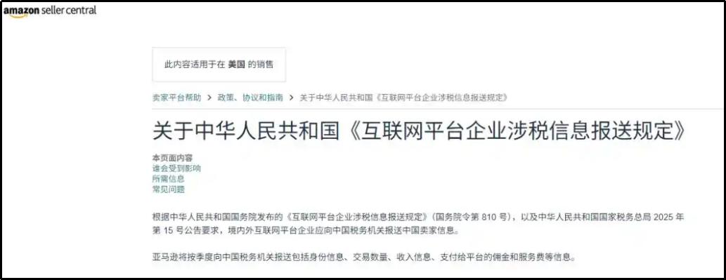 2025年10月,亚马逊宣布将按照中国税务机关的要求,向官方报送中国卖家的涉税信息,包括身份信息、交易数量、收入信息、支付给平台的佣金和服务费等信息。