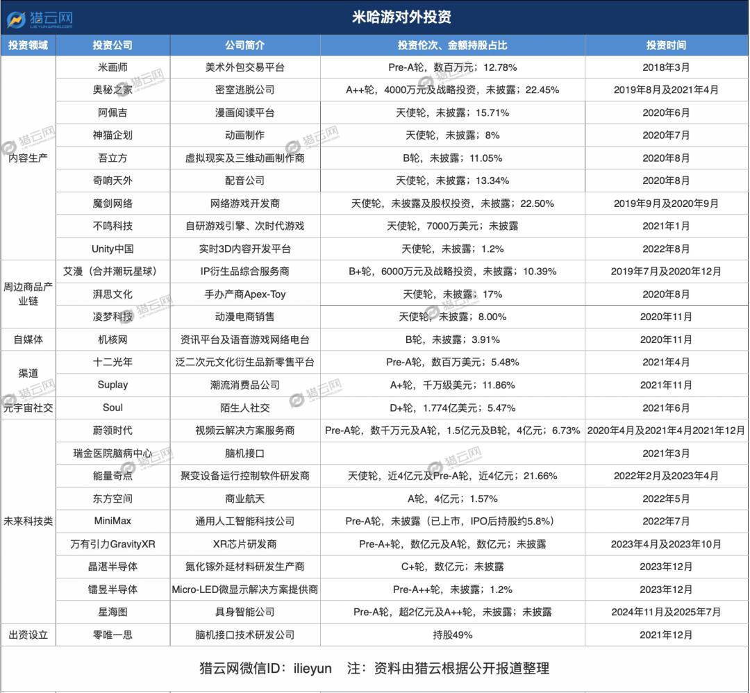 或许是创业初期四处碰壁的辛酸,过于深刻。于是,发迹后的米哈游,在关上外部投资的大门后,开启了对外投资的一扇窗。