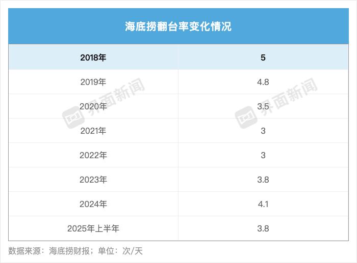 考验门店经营情况的另一个关键数据也发生了变化。2025年上半年,海底捞自营餐厅整体翻台率降至3.8次/天,去年同期为4.2次/天,距离疫情前2019年的4.8次/天的差距愈发拉大。