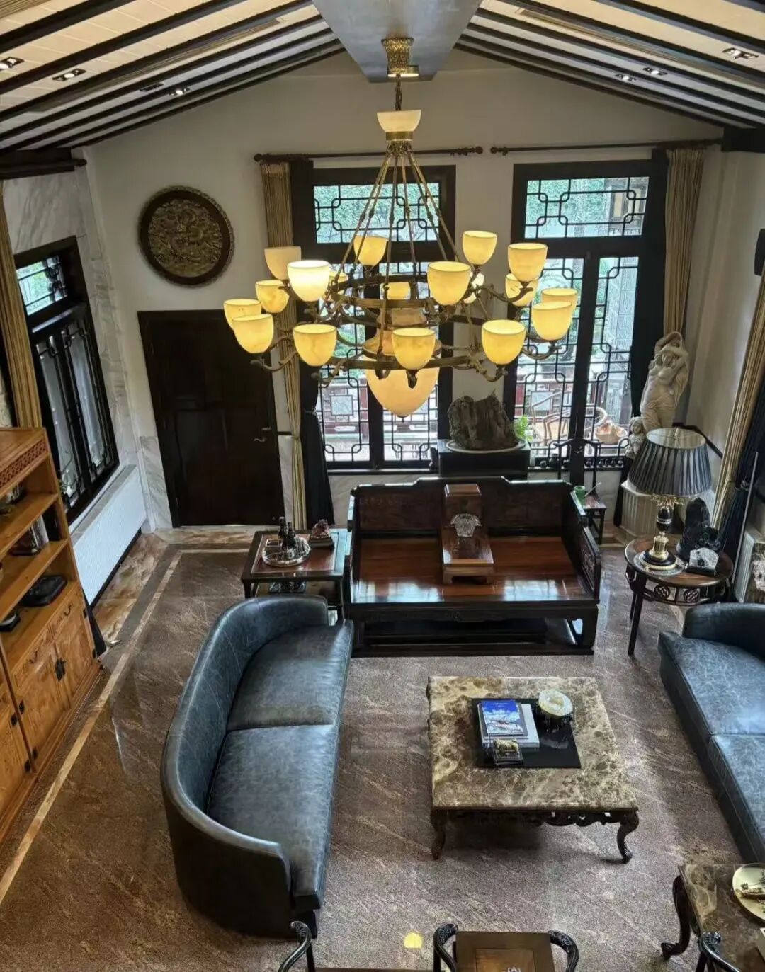 令人瞩目的是其建造用材与装修规格。根据中介介绍,宅院建造时仅金丝楠木与乌木的用量就接近700吨,园林内墙镶嵌的宋代古石板、锦鲤池内铺设的树化玉石等,均为稀缺材质。