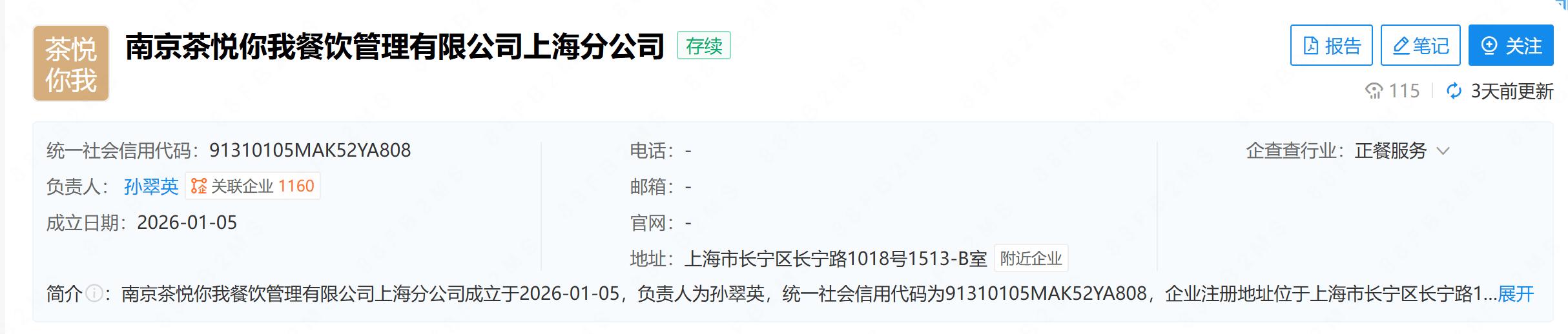 另据天眼查,1月5日,南京茶悦你我餐饮管理有限公司(下称“南京茶悦”)在上海成立分公司,经营范围涉及餐饮服务、食品互联网销售、食品销售、餐饮管理、企业总部管理等。南京茶悦成立于2022年,由茶颜悦色母公司——湖南茶悦文化产业发展集团有限公司全资持股,同年,茶颜悦色在南京开出门店,首次进入江浙沪市场。