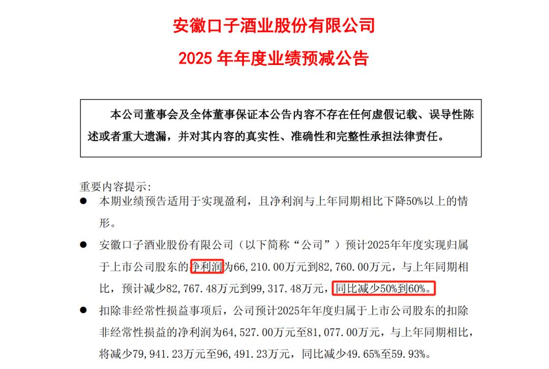 真正的产业信号,往往隐藏在冰冷的财务数字里。日前“徽酒老三”口子窖交出2025年业绩预告,其归母净利润预计同比锐减50%—60%,仅为6.62亿至8.28亿元。