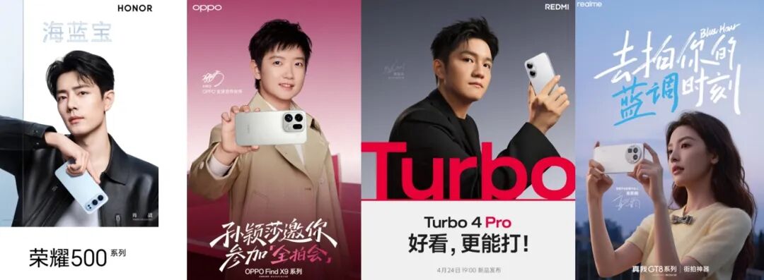 荣耀 X 肖战、OPPO X 孙颖莎、Redmi X 樊振东、真我 X 章若楠 图源:微博