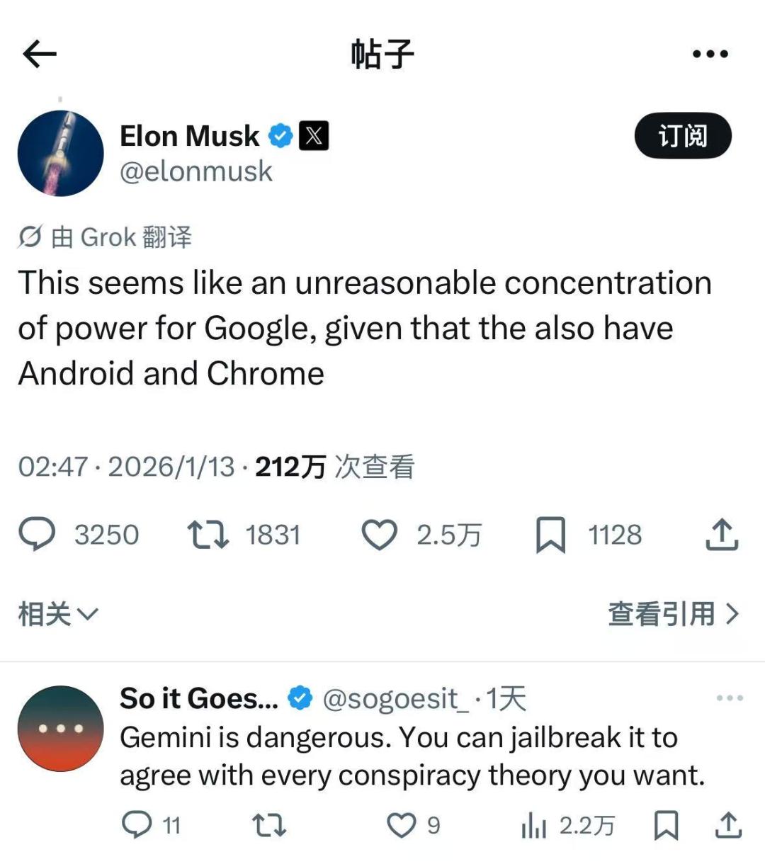 马斯克在社交媒体上公开炮轰称,“考虑到Google已经拥有Android和Chrome,这似乎是一种不合理的权力集中。”明眼人都能看到,马斯克觉得不合理,更多指向的是谷歌垄断地位,双方合作,谷歌才是更大的受益者。
