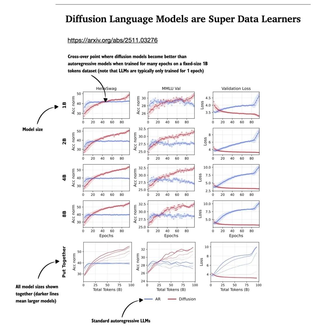 我原本计划讨论一月份发布的近期一系列有趣的研究,但我还是想简要重点介绍一篇我在「待读论文」清单上的、2025 年 11 月的有趣论文,它强调了扩散语言模型的一个有趣优势:《Diffusion Language Models are Super Data Learners》。